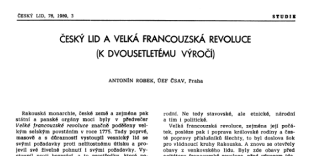 ROBEK, Antonín, 1989. ČESKÝ LID A VELKÁ FRANCOUZSKÁ REVOLUCE (K DVOUSETLETÉMU VÝROČÍ). Online. Český lid. Roč. 76, č. 3, s. 129-132. Dostupné z: https://www.jstor.org/stable/42703628.