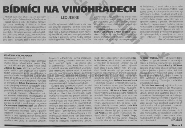 Dalším artefaktem (Dokument č. 9) je recenze či kritika muzikálového představení Bídníků z roku 1992. Ta je dostupná z archivu Ústavu pro českou literaturu, kde jsou noviny, ve kterých recenze vyšla, digitalizovány pro studijní účely. Kritik se zde věnuje písním a hereckým výkonům. Kritizuje nezkušené herce a chválí povedené adaptace písní do českého jazyka.