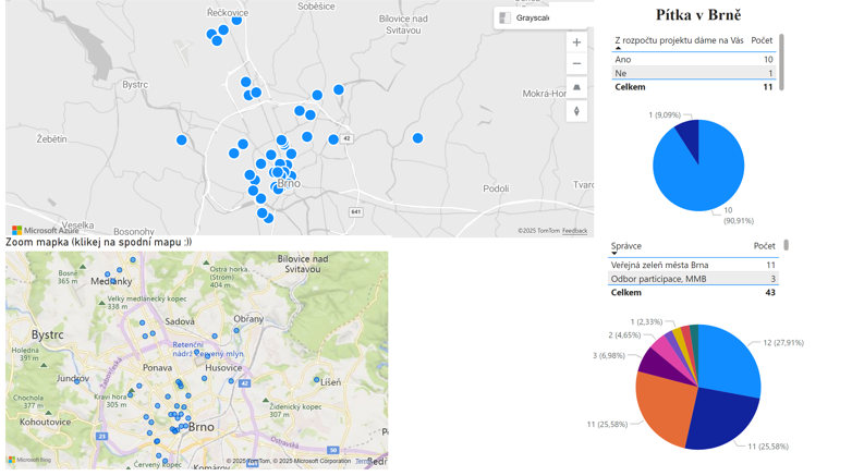Na první straně je dashboard k tabulce sportovišť, pítka na straně 2. Nepodařilo se mi sloučit data do jedné mapy, což byl původní plán -> Souřadnice šly vložit pouze z jedné tabulky, nikoli z obou.
